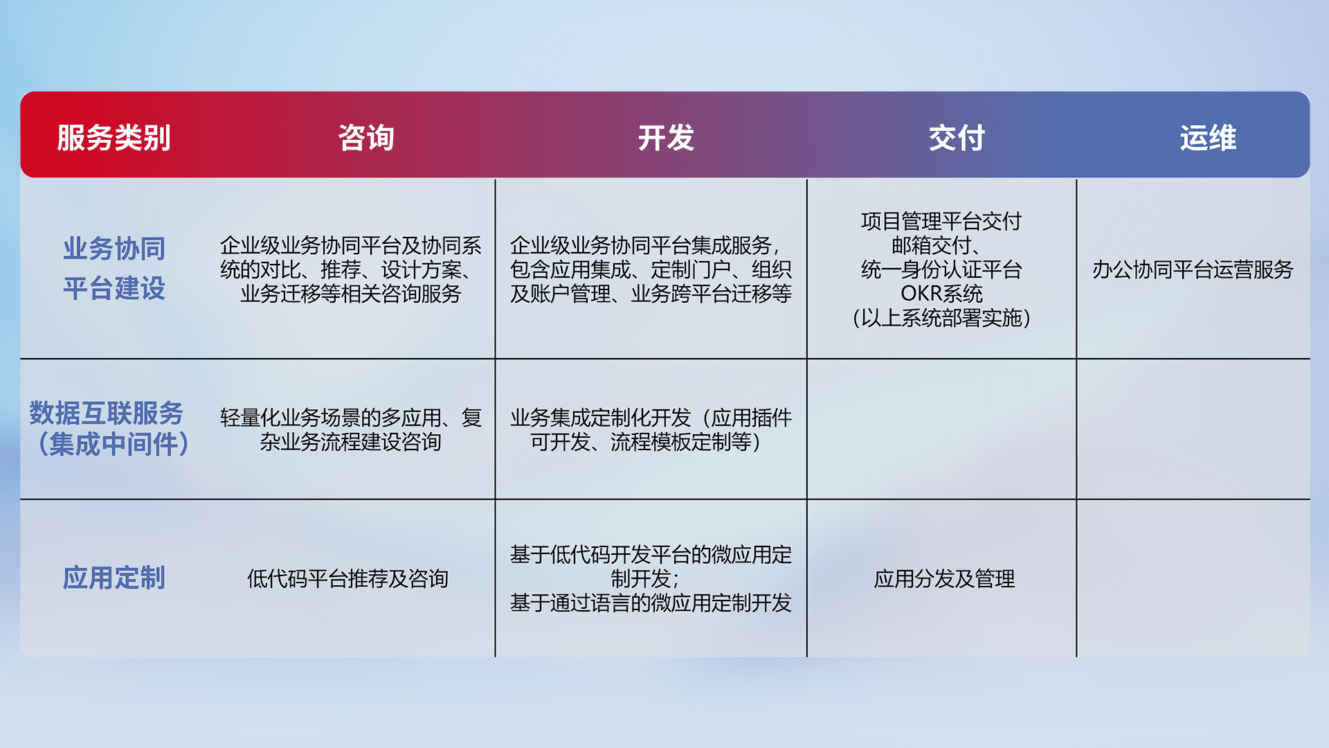 针对钉钉、、、、企微、、IDaas等平台级产品提供产品的规划、、、方案、、、、交付、、、定制化开发等服务,,,,实现如统一协同办公、、、智能客户服务、、、、混合会议管理、、智能数据查询、、等业务场景,,,实现数字化转型。。。。