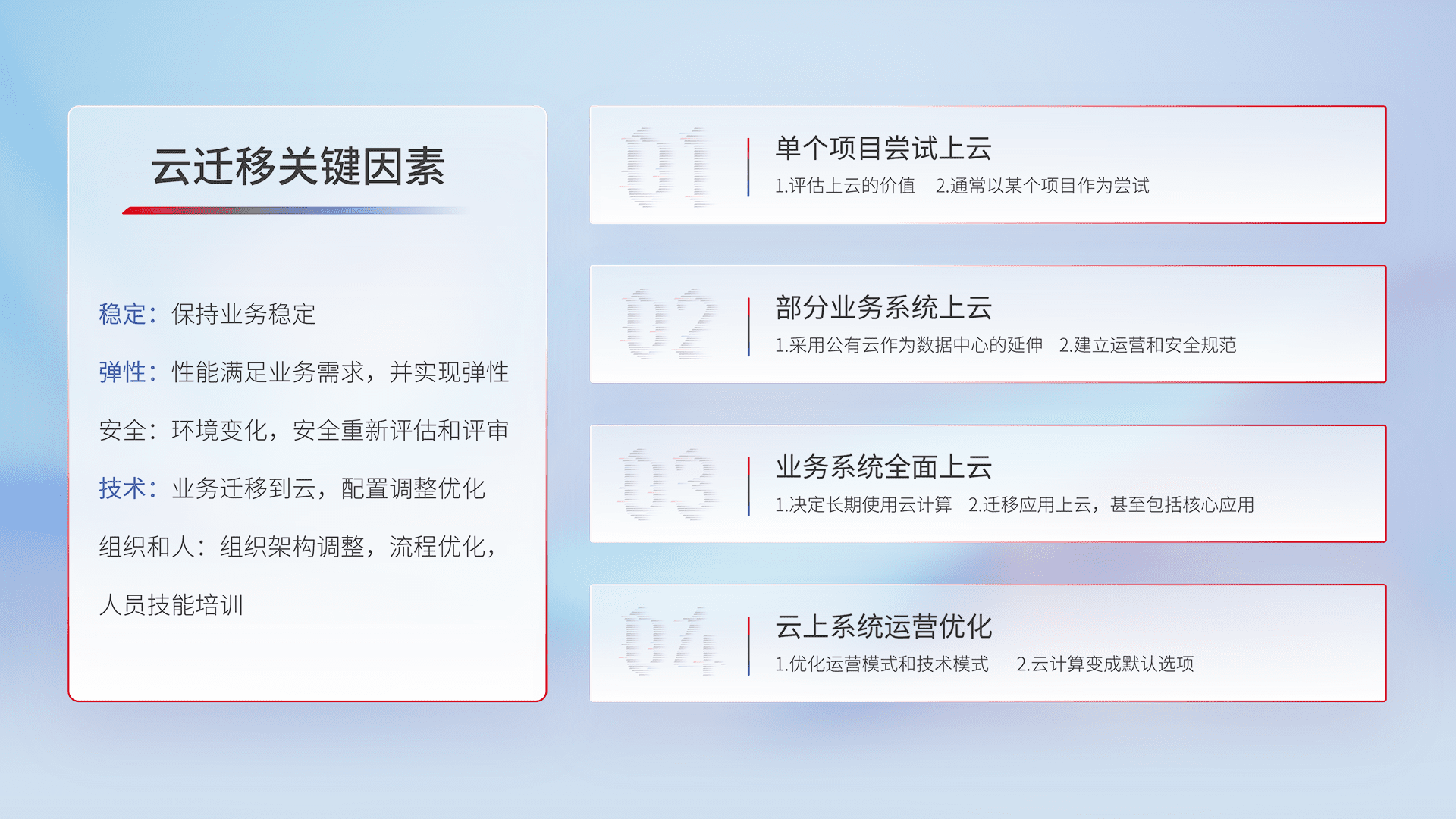 结合实际业务,,从规划设计、、云平台选型、、、云原生改造、、数据迁移、、、集成交付,,迁移全过程为客户识别最佳上云路径,,做好风险识别管理,,设计网络架构、、身份权限、、安全审计合规、、操作审计、、、、日志审计、、、、监控告警策略、、、、多站点容灾设计等,,,对云上基础设施进行整体规划,,,提升IT治理水平,,以满足弹性、、、高可用、、高性能的需求。。。