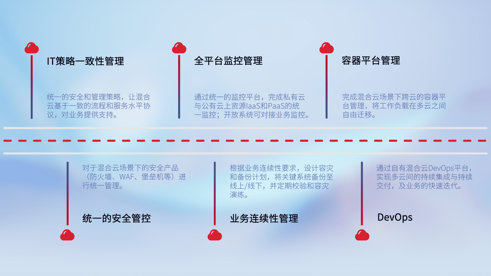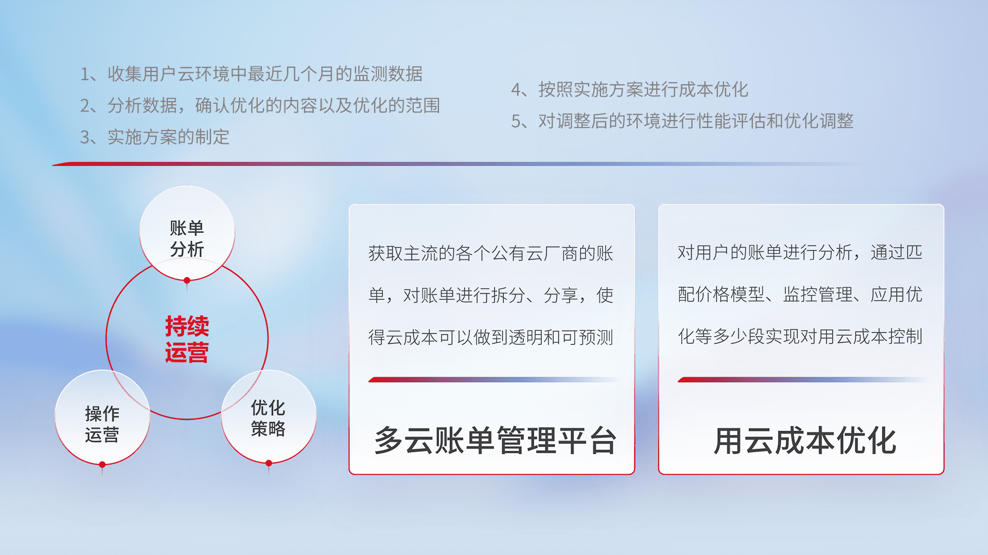 通过多云纳管,,,,以统一的资源数据模型把客户的云资源进行抽象和封装,,进而实现对多云资源的统一操作,,,保障云资源管理的可靠性、、稳定性与可用性。。。量身定制化运维内容,,配置、、、开发运维、、、补丁管理、、、、备份、、监控、、、认证和访问管理、、审计和日常巡检等,,保障在用云过程中的可靠度,,,稳定度以及高可用率。。。