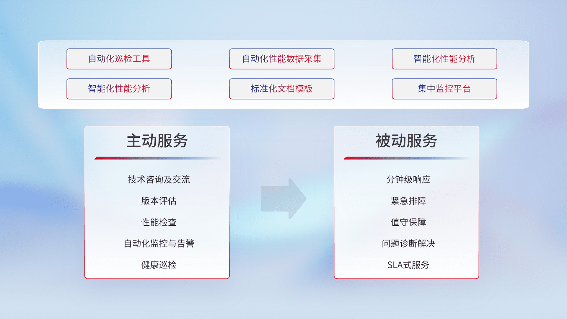 智能化工具和标准化文档,,,保障服务质量,,,提供主动服务(包含技术咨询、、版本评估、、、、性能检查、、自动化监控与告警、、健康巡检)和被动服务包含(分钟级响应、、、紧急排障、、、值守保障、、、问题诊断解决、、、SLA服务)。。。。